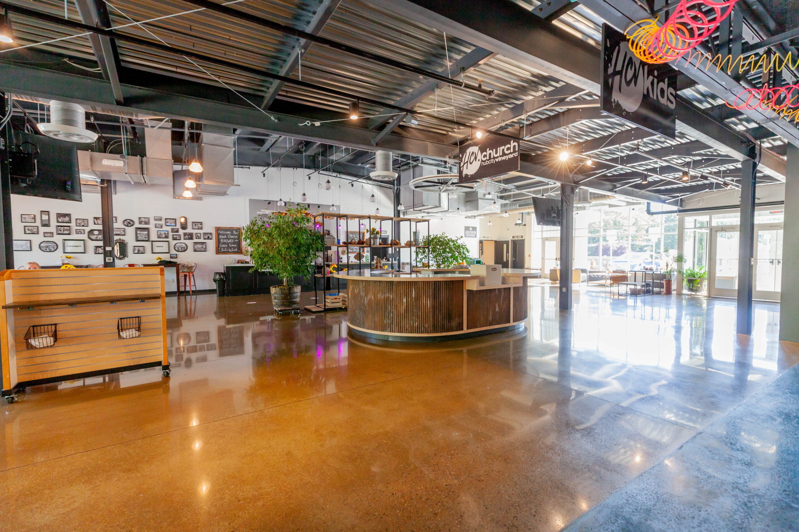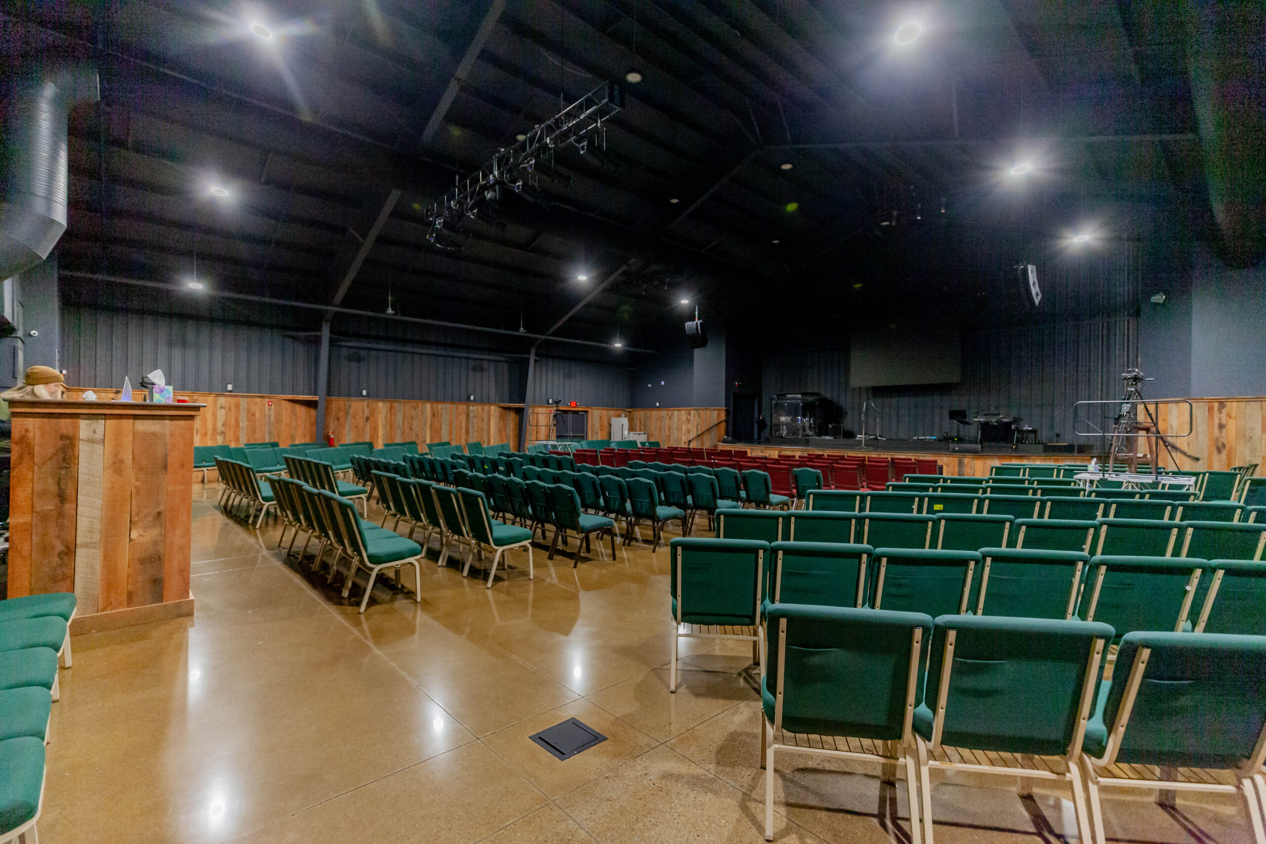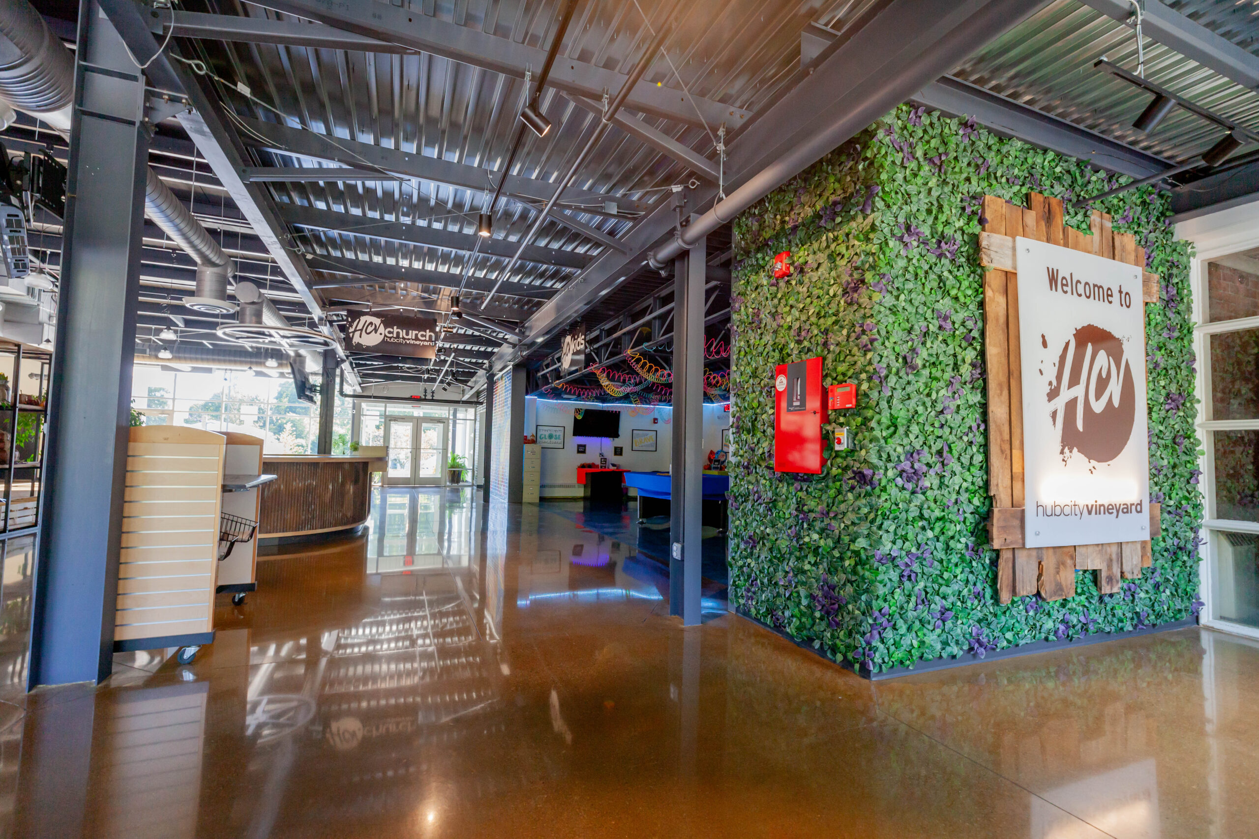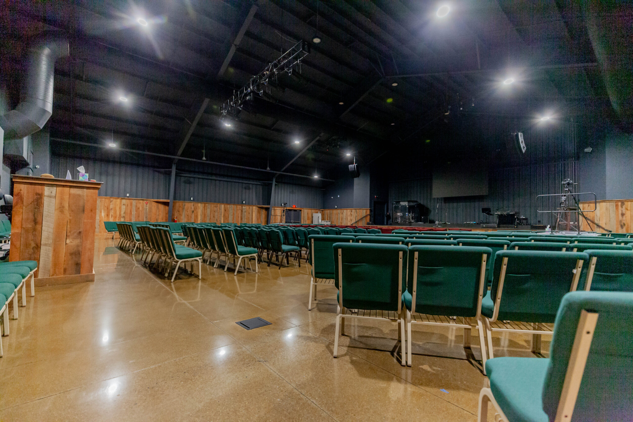 Constructed a new 13,000 sq. ft. steel building for HCV Church. Included insulated metal roof panels; the interior walls of sanctuary had perforated metal liner panel and wood wainscoting. Floors included polished and dyed concrete floors in sanctuary and vestibules.