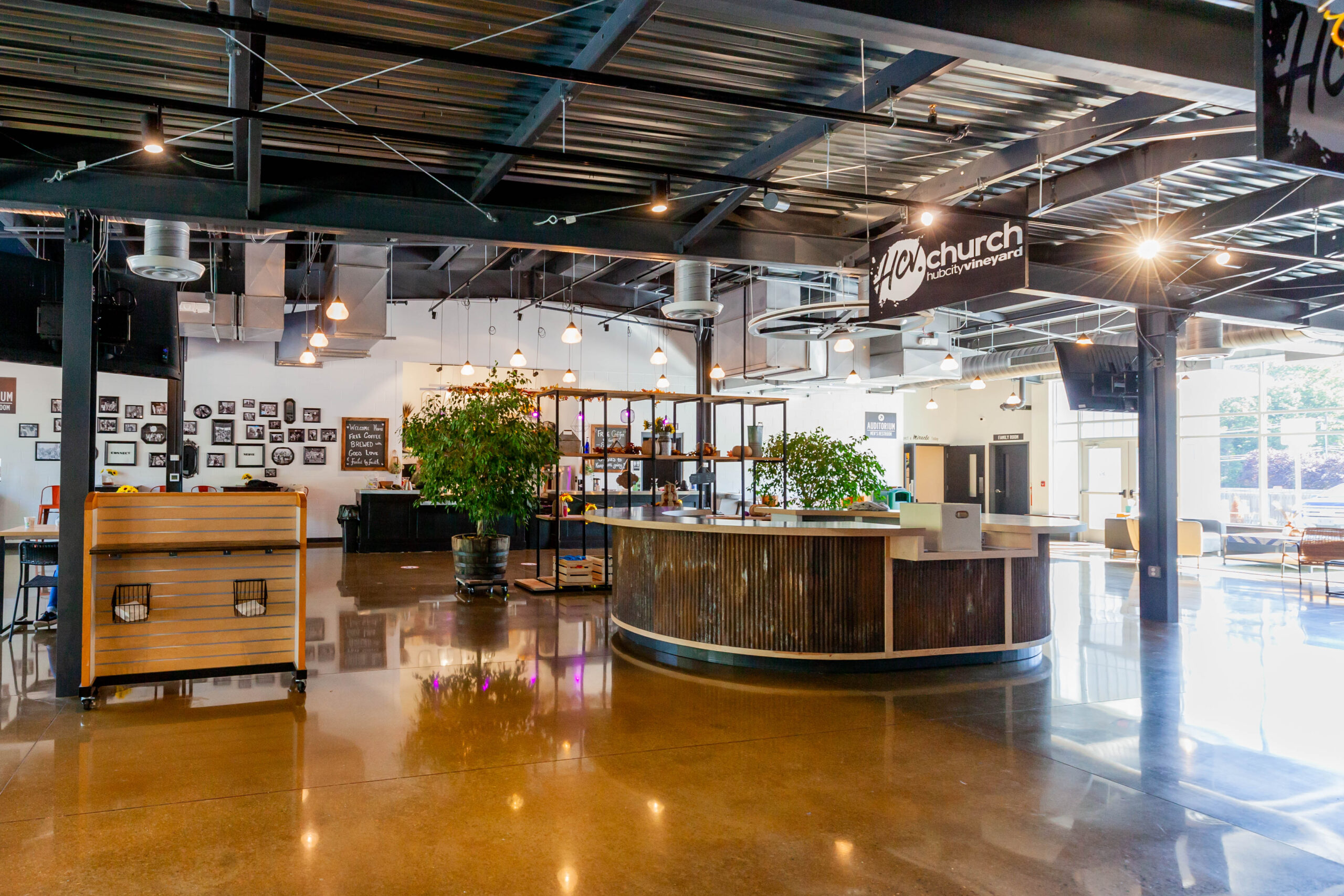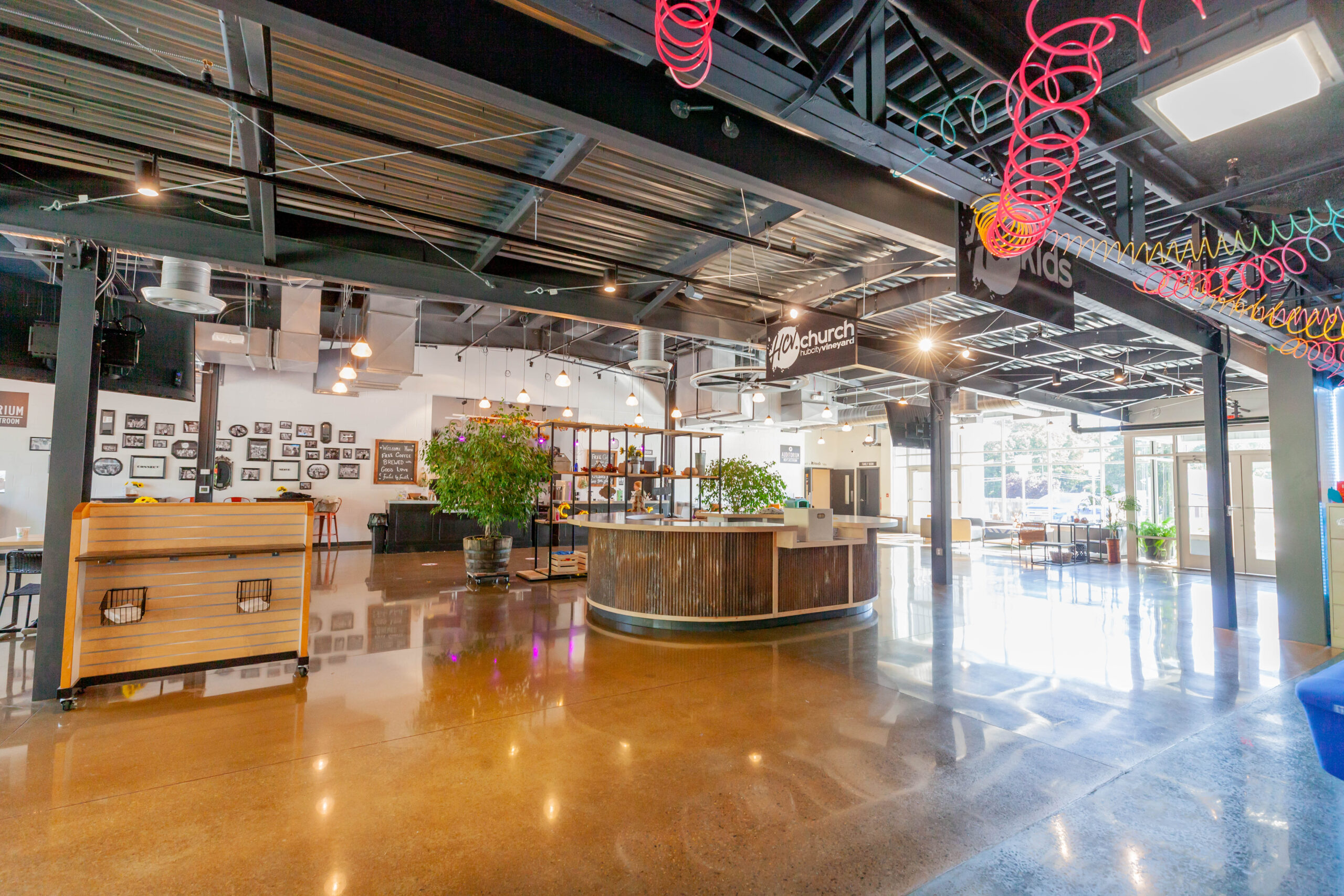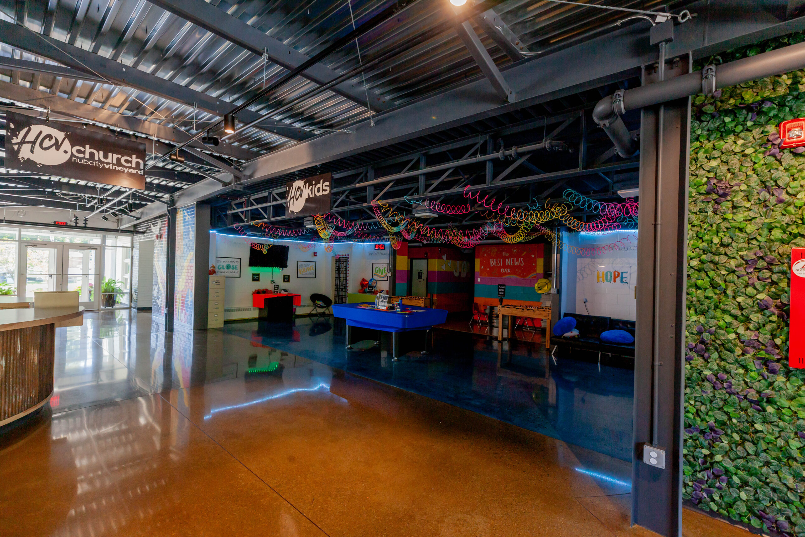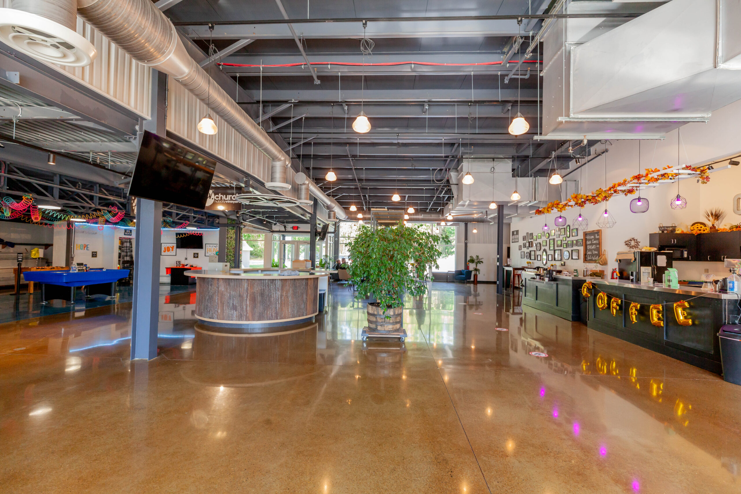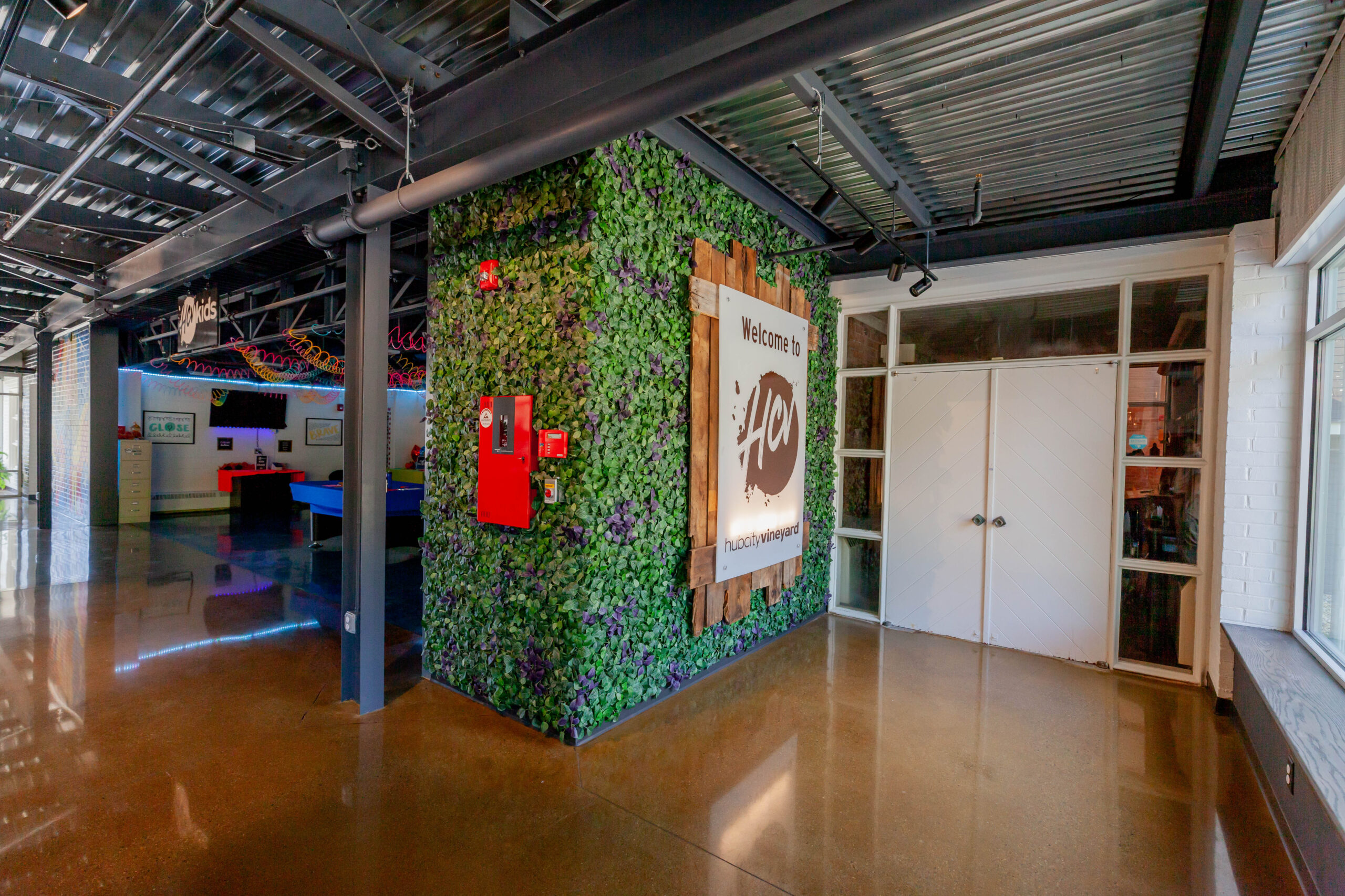 Constructed a new 13,000 sq. ft. steel building for HCV Church. Included insulated metal roof panels; the interior walls of sanctuary had perforated metal liner panel and wood wainscoting. Floors included polished and dyed concrete floors in sanctuary and vestibules.