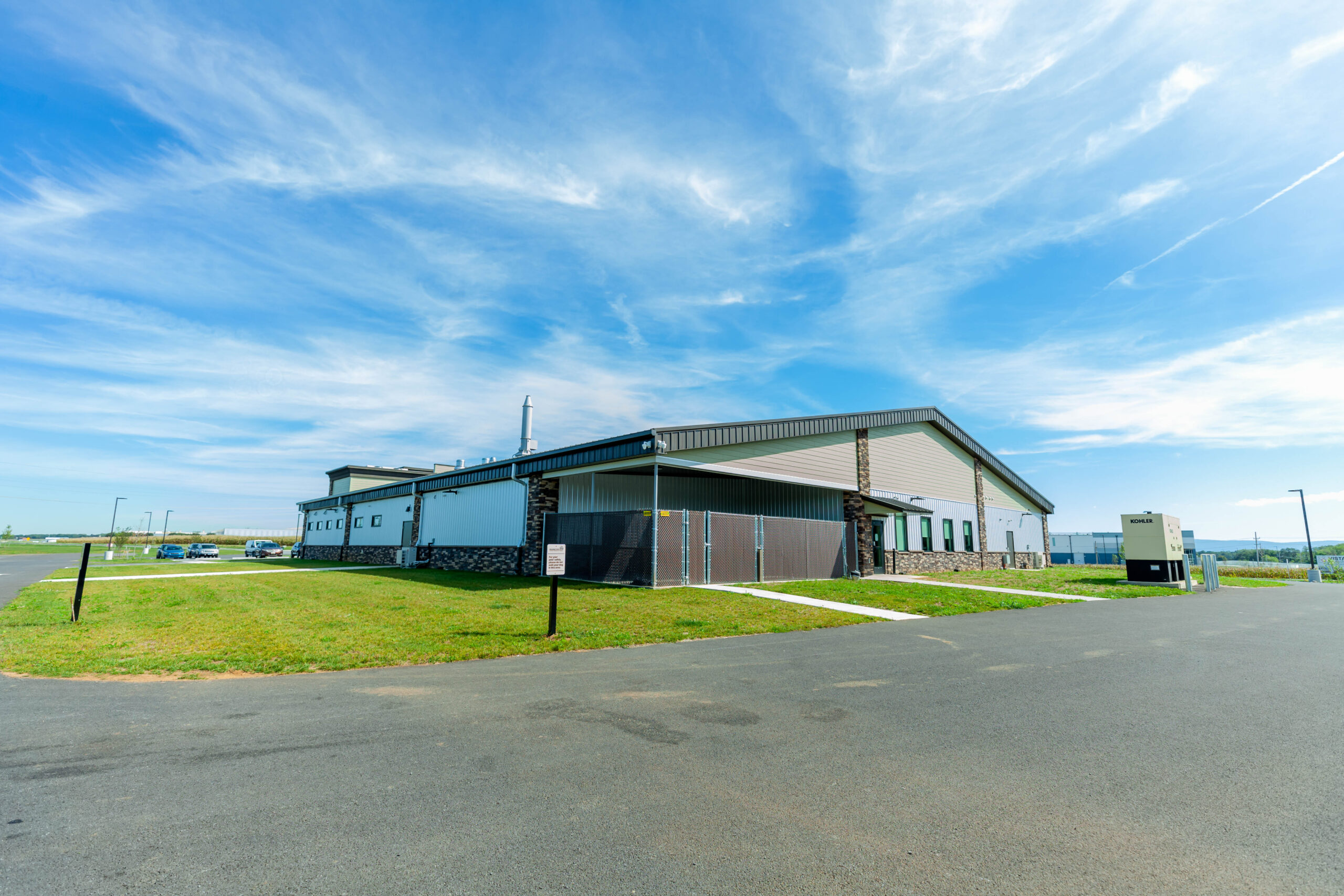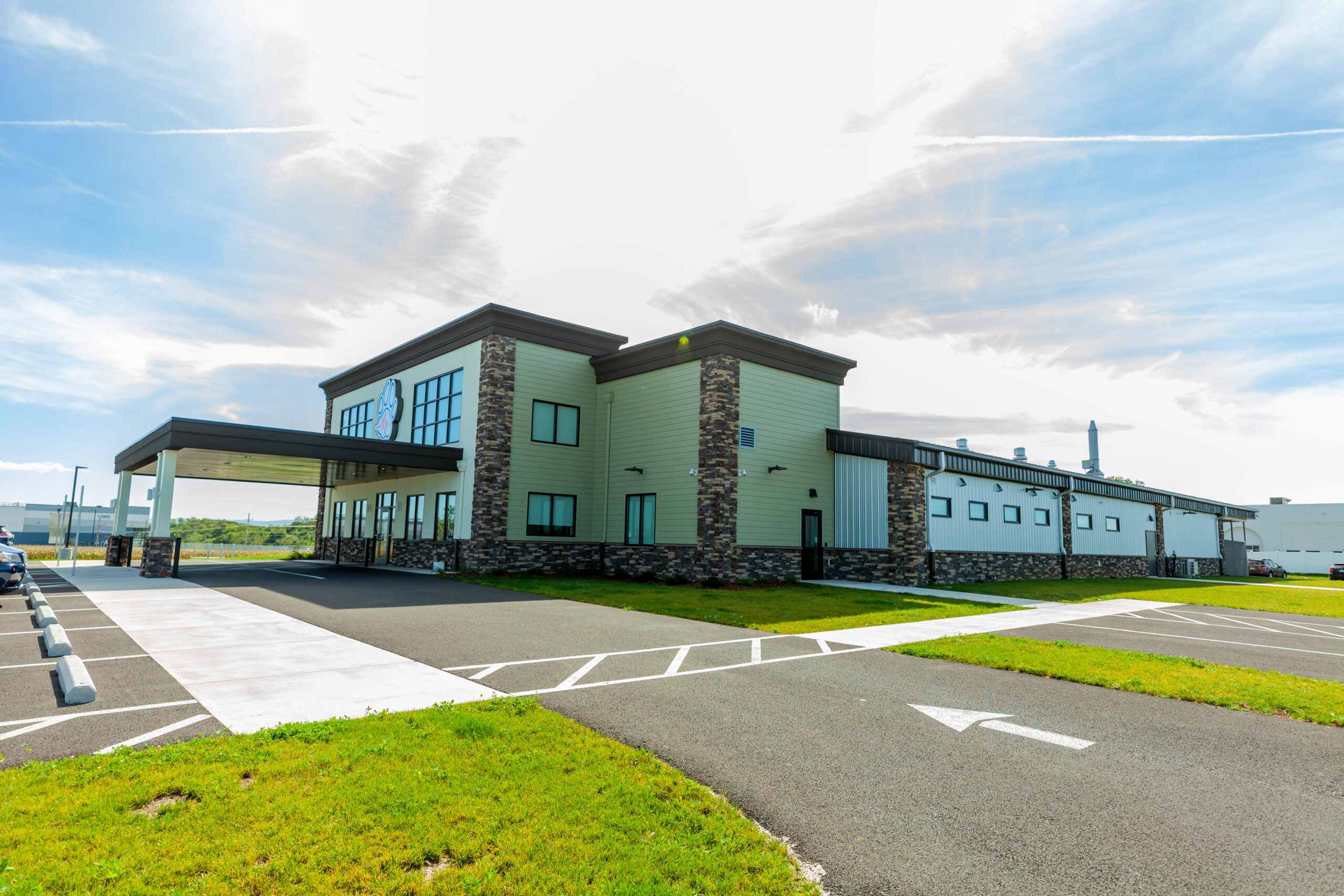 Inside, the facility is finished with a mix of drywall and FRP wall systems, acoustical and drywall ceilings, and a blend of epoxy and carpet flooring with vinyl and epoxy base. The space is completed with custom cabinetry and countertops designed for both functionality and aesthetics.