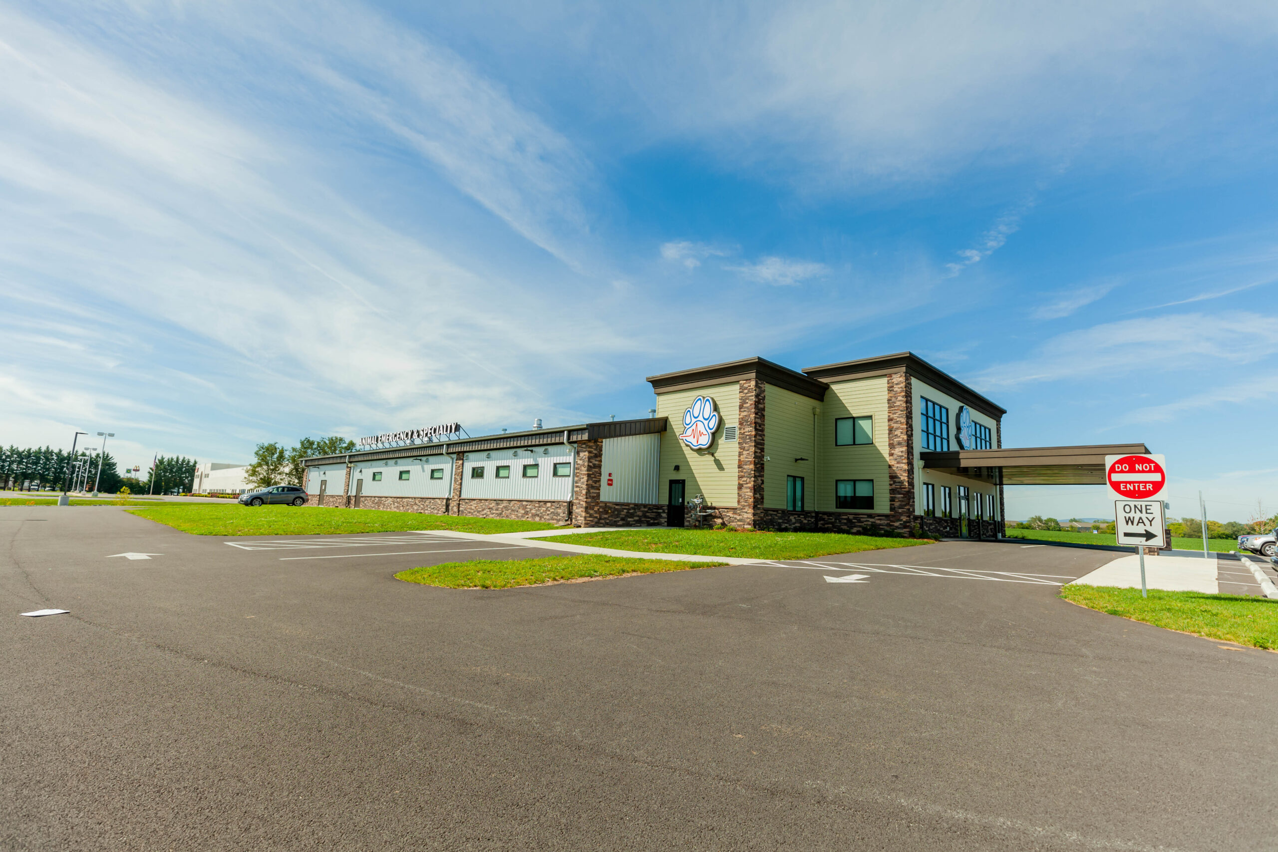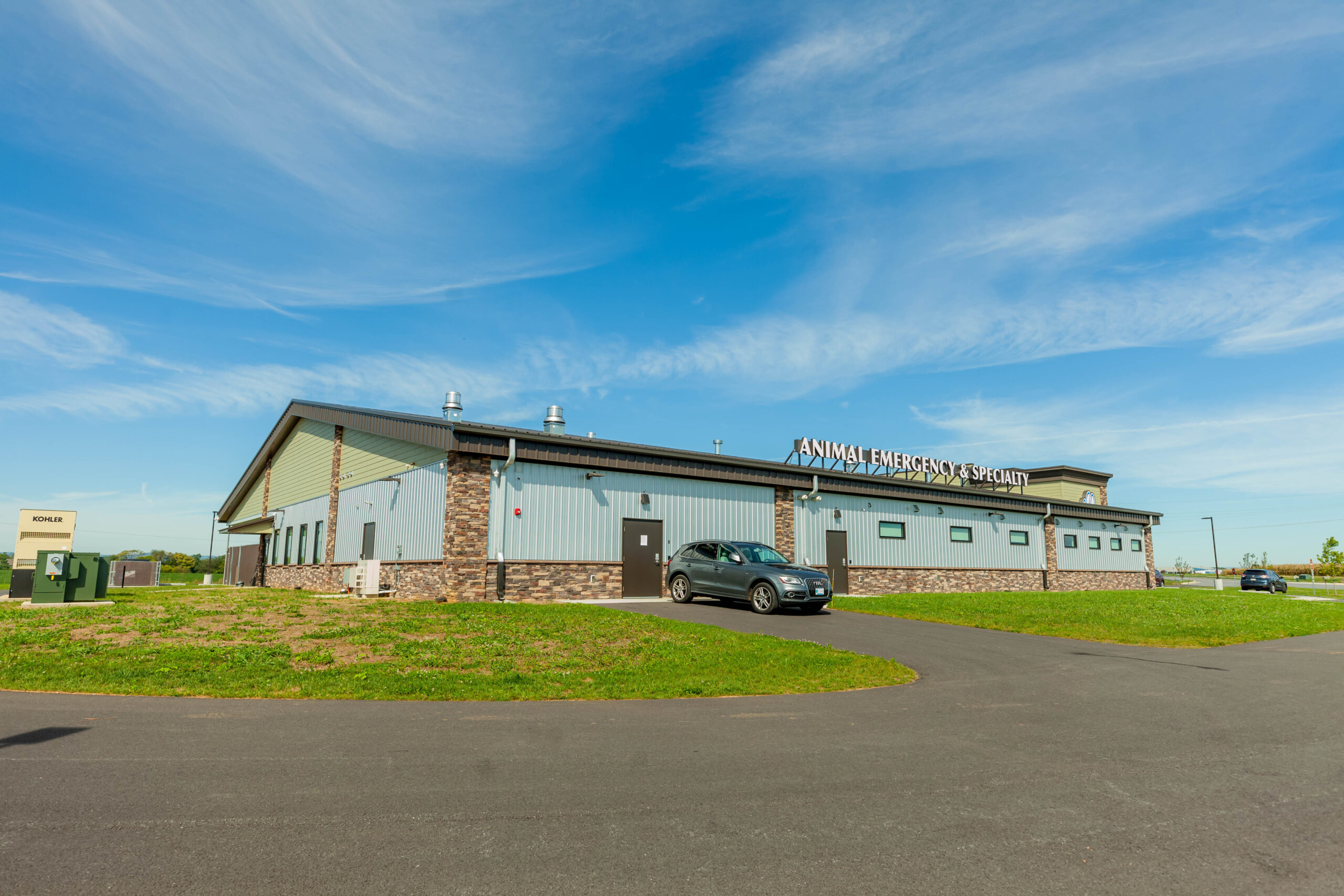 This 17,000-square-foot veterinary hospital features a combination of post-frame wood construction for the main pitched roof area and steel bar joists with decking for the flat roof sections at the entrance. Exterior finishes include Galvalume metal panels, stone veneer, fiber cement siding, stucco, aluminum storefront systems, and detailed soffits, gutters, and trims.